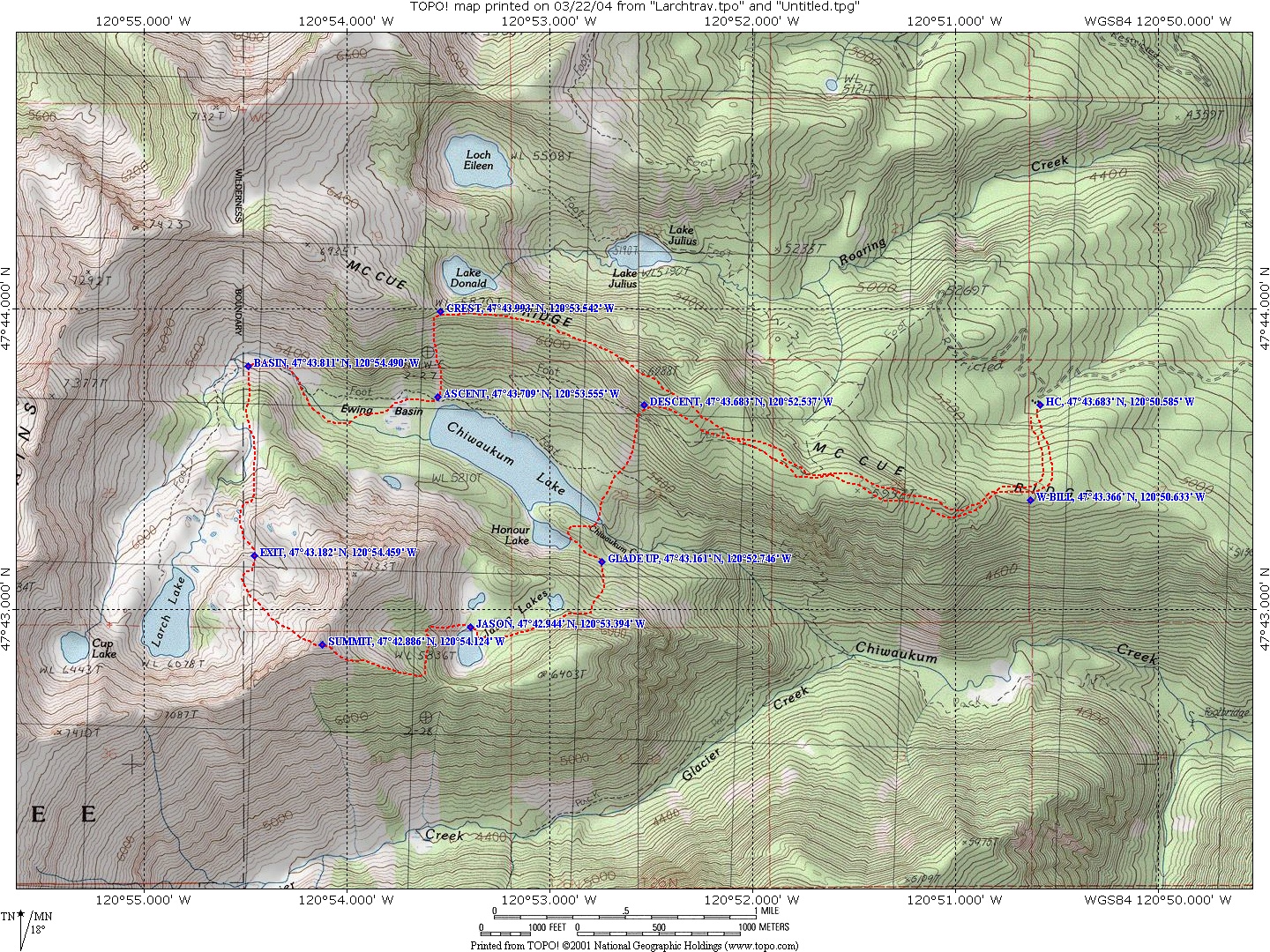 This is a long beautiful run out the Larch Lake trail route to Chiwaukum Lake. There is one low altitude cliff band just above Larch Lake that should be skirted to the right, then follow the right side of the creek out. I started my climb back up Mc Cue Ridge at the head of Chiwaukum Lake were there was a clear glade that I could switchback straight up to the ridge. This summated on the ridge just above Lake Donald (beyond High Point), then just follow the ridge back to Wild Bill Hill. The whole route is about 4,000' vertical and ten miles. It shouldn't be done though unless the snow conditions look stable and skiing is good, but if they are what a remarkable trip.